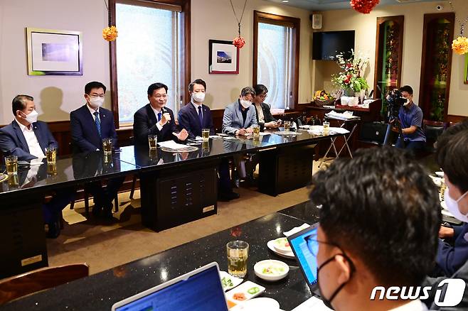(서울=뉴스1) = 송영길 더불어민주당 대표를 비롯한 방미단이 20일(현지시간) 미국 워싱턴 에난데일 한인타운에서 특파원 기자간담회를 하고 있다. (더불어민주당 제공) 2021.9.21/뉴스1