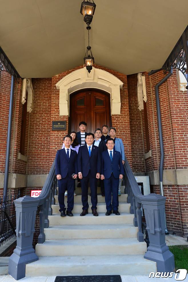 (서울=뉴스1) = 송영길 더불어민주당 대표를 비롯한 방미단이 20일(현지시간) 미국 워싱턴 로간서클 소재 주한대한제국공사관을 방문해 기념촬영을 하고 있다. (더불어민주당 제공) 2021.9.21/뉴스1