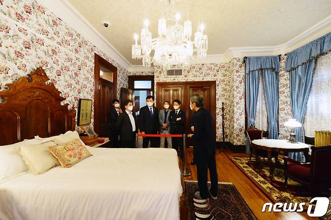 (서울=뉴스1) = 송영길 더불어민주당 대표를 비롯한 방미단이 20일(현지시간) 미국 워싱턴 로간서클 소재 주한대한제국공사관을 방문해 설명을 듣고 있다. (더불어민주당 제공) 2021.9.21/뉴스1