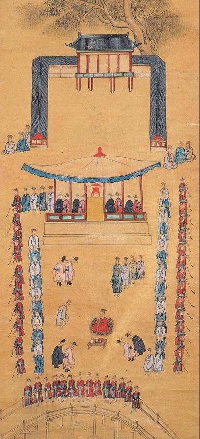 | ▲ 성균관친림강론도(19세기) 궁궐에서 행해진 경연의 전통을 알 수 있는 그림으로 이 그림은 왕이 행차하여 유생들의 공부상황을 살피고 강의를 펼치는 모습을 볼 수 있다. |