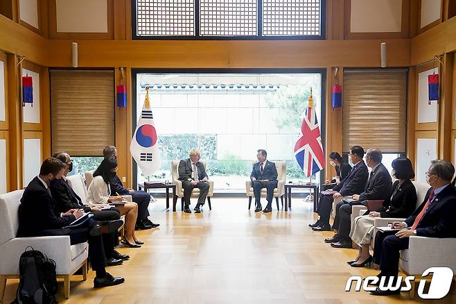 (서울=뉴스1) = 문재인 대통령이 20일(현지시간) 미국 뉴욕 주유엔대표부 양자회담장에서 보리스 존슨 영국 총리와 정상회담을 하고 있다. (청와대 제공) 2021.9.21/뉴스1