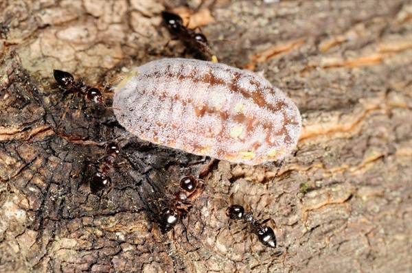 | ▲ 짚신깍지벌레와 개미의 공생. 개미들이 짚신깍지벌레를 둘러싸고 감로수를 얻어 먹는다. |