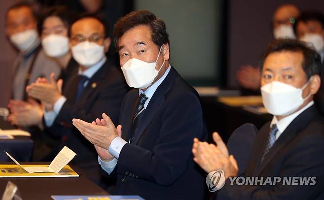 (전주=연합뉴스) 김동철 기자 = 더불어민주당 대권주자인 이낙연 경선 후보(가운데)가 추석인 21일 전북 전주시 완산구의 한 호텔에서 열린 ESG전북네트워크의 이 후보 지지 선언식에서 손뼉을 치고 있다. 2021.9.21
