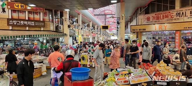 [청주=뉴시스] 안성수 기자 = 20일 충북 청주 육거리시장은 추석 장을 보러 온 시민들로 북새통을 이루고 있다. 국민지원금, 최대 8인 모임 허용 등 조치 영향으로 전통시장은 코로나19 직격탄을 맞은 지난 명절과 달리 대목을 맞고 있다. 2021.09.21. hugahn@newsis.com