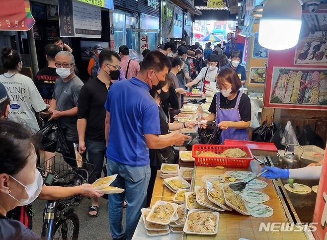 [청주=뉴시스] 안성수 기자 = 20일 충북 청주 육거리시장 내 전집이 추석 장을 보러 온 시민들로 북새통을 이루고 있다. 국민지원금, 최대 8인 모임 허용 등 조치 영향으로 전통시장은 코로나19 직격탄을 맞은 지난 명절과 달리 대목을 맞고 있다. 2021.09.21. hugahn@newsis.com