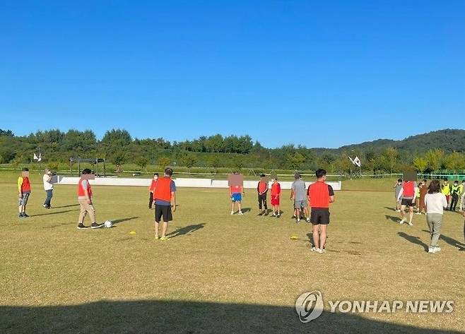 (서울=연합뉴스) 추석 명절을 앞둔 지난 19일 충북 진천군 국가공무원 인재개발원에서 박범계 법무부 장관이 아프가니스탄 청소년들과 축구 시합을 하고 있다. 2021.9.21