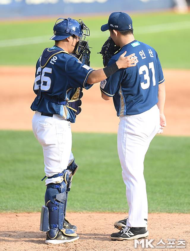 8회말 1사 만루에서 NC 박대온, 안인산이 이야기를 나누고 있다.