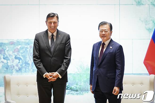 (서울=뉴스1) = 문재인 대통령이 20일(현지시간) 미국 뉴욕 주유엔대표부 양자회담장에서 보루트 파호르 슬로베니아 대통령과 정상회담에 앞서 기념촬영을 하고 있다. (청와대 제공) 2021.9.21/뉴스1