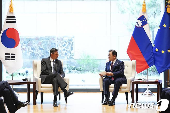 (서울=뉴스1) = 문재인 대통령이 20일(현지시간) 미국 뉴욕 주유엔대표부 양자회담장에서 보루트 파호르 슬로베니아 대통령과 정상회담을 하고 있다. (청와대 제공) 2021.9.21/뉴스1