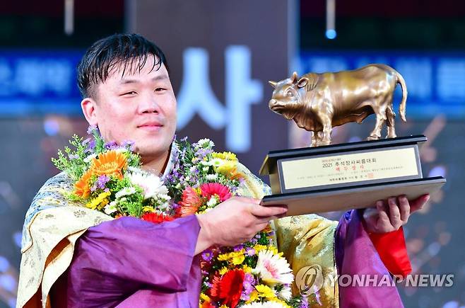 (서울=연합뉴스) 21일 충청남도 태안군 태안종합실내체육관에서 열린 '위더스제약 2021 추석장사씨름대회' 백두장사(140kg이하)에 등극한 김진(증평군청)이 황소트로피를 들고 기념사진을 찍고 있다. 2021.9.21