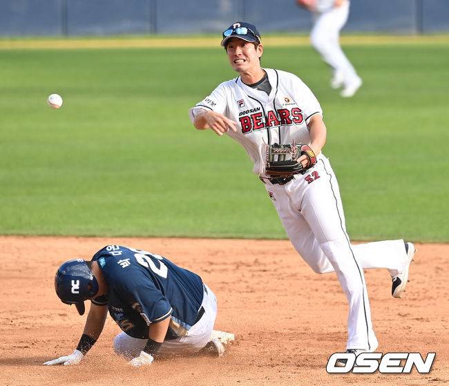 9회초 무사 1루 상황 NC 김주원의 내야 땅볼 때 두산 유격수 김재호가 주자 박대온을 2루에서 포스아웃 시킨 뒤 1루로 송구하고 있다. 타자주자는 1루 세이프. 2021.09.21 / dreamer@osen.co.kr