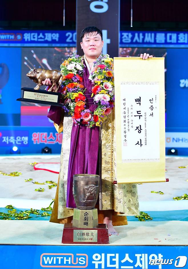 (서울=뉴스1) = 21일 충남 태안군 태안종합실내체육관에서 열린 위더스 제약 2021 추석장사씨름대회 백두장사(140kg 이하)에 등극한 김진(증평군청)이 장사인증서와 황소트로피를 들고 기념촬영을 하고 있다. (대한씨름협회 제공) 2021.9.21/뉴스1