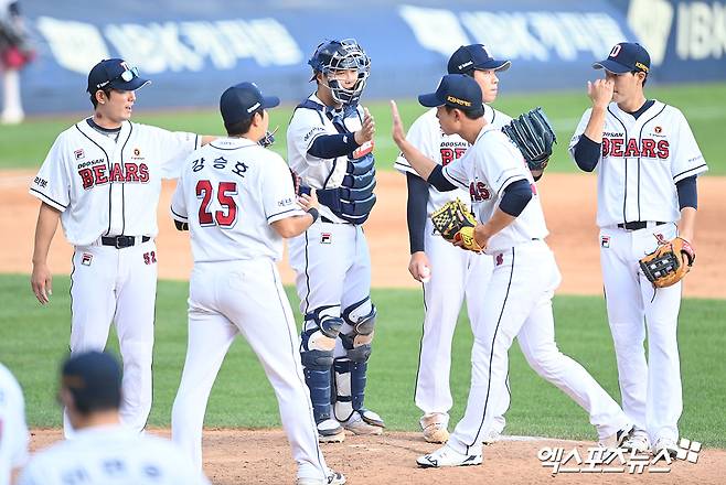 이날 경기에서 승리한 두산 선수들이 기뻐하고 있다.