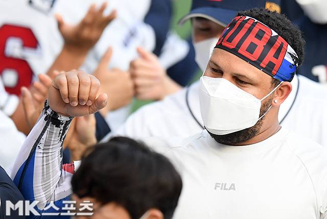 두산 페르난데스가 경기를 마친 뒤 하이파이브 하고 있다.