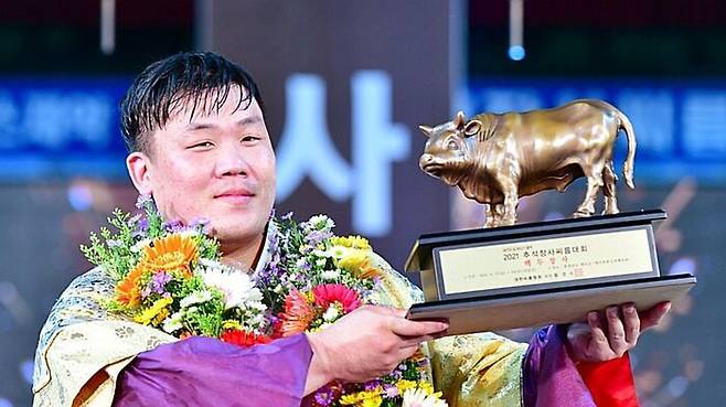 김진이 '위더스제약 2021 추석장사씨름대회'서 백두장사 꽃가마에 올랐습니다.