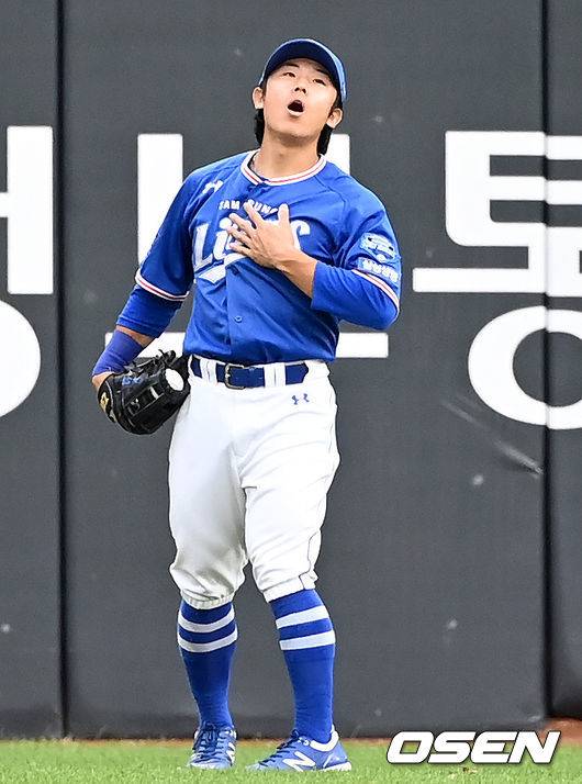 8회말 2사 만루 삼성 우익수 김성윤이 롯데 정훈의 타구를 라인드라이브로 잡아낸 뒤 안도하고 있다. 2021.09.21 /ksl0919@osen.co.kr