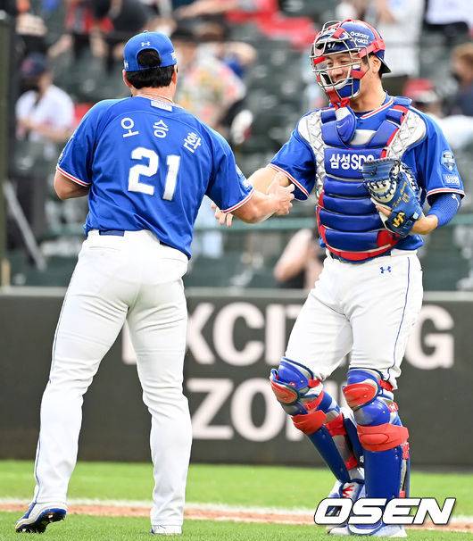 승리가 확정된 순간 삼성 오승환, 강민호가 기쁨을 나누고 있다. 2021.09.21 /ksl0919@osen.co.kr