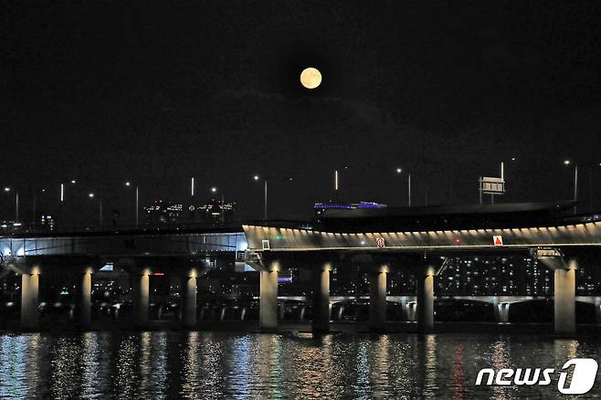 (서울=뉴스1) 조태형 기자 = 추석인 21일 오후 서울 도심 위로 동그란 보름달이 떠오르고 있다. 2021.9.21/뉴스1