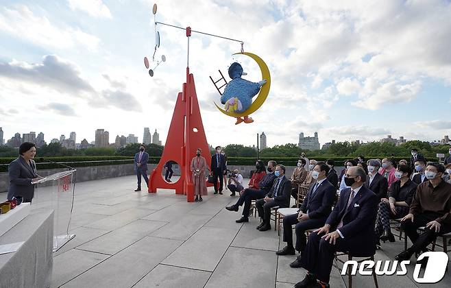 (서울=뉴스1) = 제76차 유엔총회를 계기로 문재인 대통령과 함께 미국 뉴욕을 방문 중인 김정숙 여사가 20일(현지시간) 메트로폴리탄 미술관을 방문해 한국실 개관 축사를 하고 있다. (청와대 제공) 2021.9.21/뉴스1