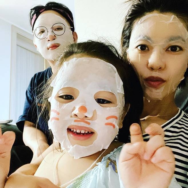 공개된 사진 속 이윤지는 남편, 큰딸 라니 양과 함께 얼굴에 팩을 붙이고 사진을 찍는 모습이다.