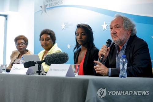 epa09479339 (L-R) Paul Rusesabagina's daughter Lys, his wife Taciana, his daughter Carine Kanimba and lawyer Vincent Lurquin attend a press conference in the aftermath of Rusesabagina's trial and verdict, at the Press Club in Brussels, Belgium, 21 September 2021. Paul Rusesabagina, a man portrayed as a hero in the Oscar-nominated film 'Hotel Rwanda' and an opponent of country?s President Paul Kagame, was sentenced to 25 years for terrorism by a court on 20 September. EPA/STEPHANIE LECOCQ