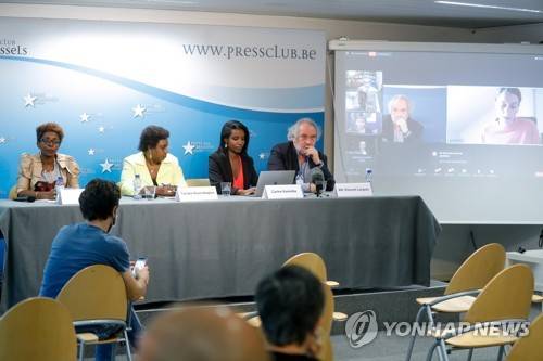 epa09479340 (L-R) Paul Rusesabagina's daughter Lys, his wife Taciana, his daughter Carine Kanimba and lawyer Vincent Lurquin attend a press conference in the aftermath of Rusesabagina's trial and verdict, at the Press Club in Brussels, Belgium, 21 September 2021. Paul Rusesabagina, a man portrayed as a hero in the Oscar-nominated film 'Hotel Rwanda' and an opponent of country?s President Paul Kagame, was sentenced to 25 years for terrorism by a court on 20 September. EPA/STEPHANIE LECOCQ