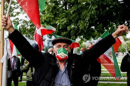 epa09479344 A man attends a protest against Iran's President Ebrahim Raisi in front of the Chancellery in Berlin, Germany, 21 September 2021. Protesters of the National Council of Resistance of Iran and the German-Iranian Society gathered in Berlin to demonstrate against Iran's regime of president Ebrahim Raisi. EPA/FILIP SINGER