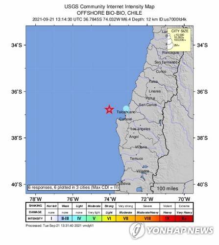 epa09479345 A handout shakemap made available by the United States Geological Survey (USGS) shows the location of a 6.5-magnitude earthquake hitting offshore Bio-Bio, Chile, 21 September 2021. The epicenter was recorded by the USGS 81 kilometers north-west of Arauco, Chile at 12.5 km depth. EPA/USGS HANDOUT HANDOUT EDITORIAL USE ONLY/NO SALES