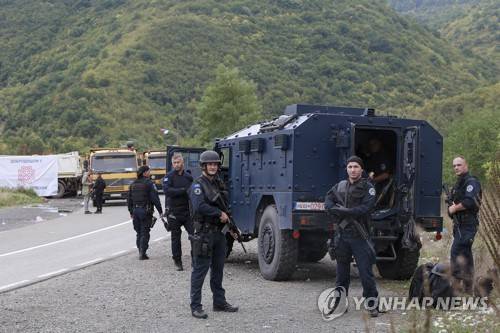 Kosovo police officers patrol a road near the northern Kosovo border crossing of Jarinje, Tuesday, Sept. 21, 2021. Tensions soared Monday when Kosovo special police with armored vehicles were sent to the border to impose a rule on temporarily replacing Serb license plates from cars while they drive in Kosovo. (AP Photo/Visar Kryeziu)