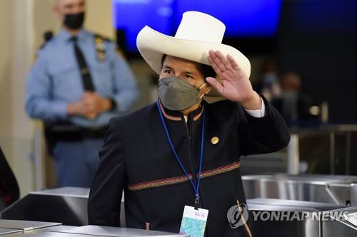 Pedro Castillo, president of Peru, arrives at United Nations headquarters, Tuesday, Sept. 21, 2021, during the 76th Session of the U.N. General Assembly in New York. (AP Photo/John Minchillo, Pool) POOL PHOTOS