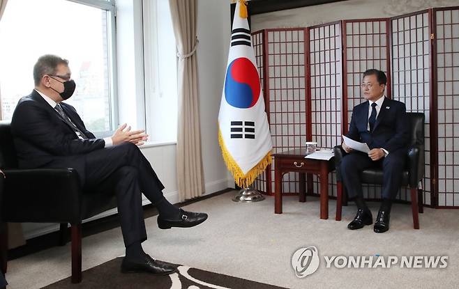 (뉴욕=연합뉴스) 최재구 기자 = 문재인 대통령이 21일(현지시각) 미국 뉴욕 시내 호텔에서 앨버트 불라 화이자 최고경영자(CEO)f를 접견하고 있다. 2021.9.21