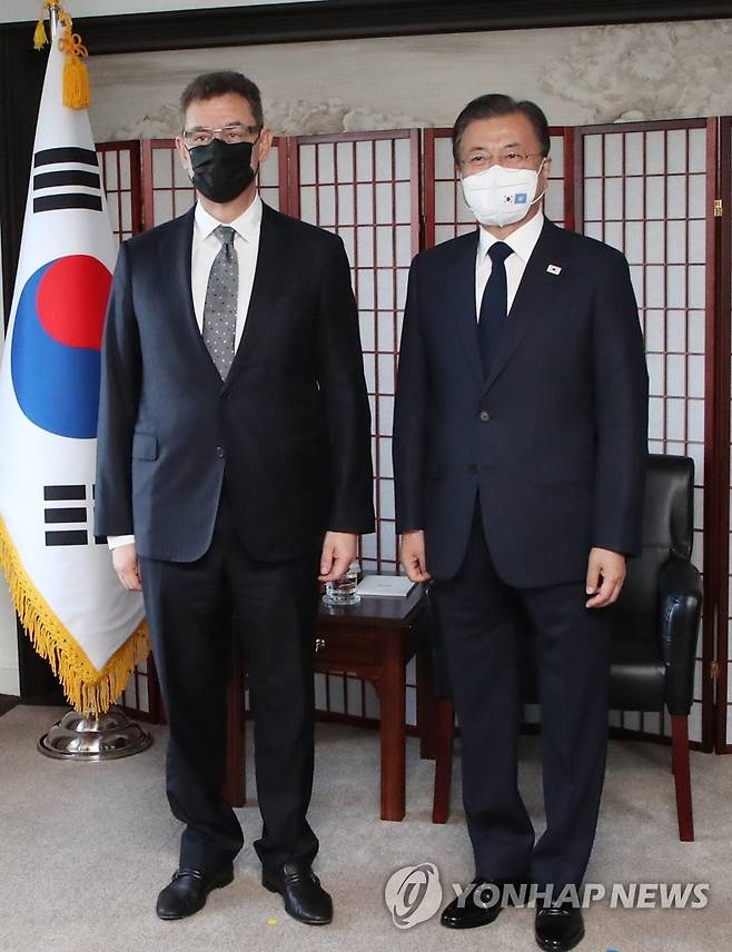 (뉴욕=연합뉴스) 최재구 기자 = 문재인 대통령이 21일(현지시각) 미국 뉴욕 시내 호텔에서 앨버트 불라 화이자 최고경영자(CEO)와 접견에 앞서 기념촬영을 하고 있다. 2021.9.21