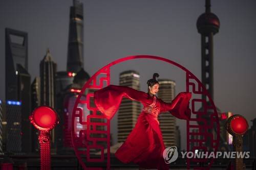 epaselect epa09479164 An artist performs along The Bund waterfront area during the Mid-Autumn Festival celebrations in Shanghai, China, 21 September 2021. The Mid-Autumn Festival, also known as Moon Festival, falls this year on 21 September. It is a traditional harvest festival celebrated in many Asian countries and considered one of the most important holidays, after the Chinese Lunar New Year. EPA/ALEX PLAVEVSKI