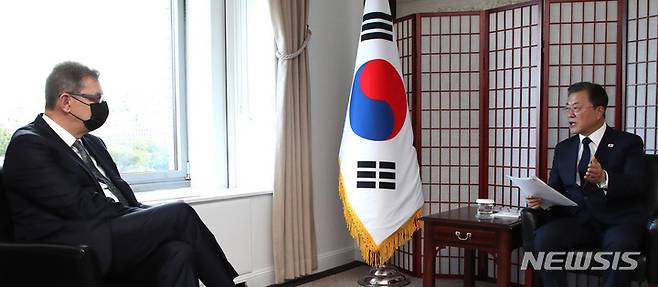 [뉴욕=뉴시스] 김진아 기자 = 문재인 대통령이 21일(현지시간) 미국 뉴욕의 한 호텔에서 앨버트 불라 화이자 최고경영자(CEO)를 접견, 발언하고 있다. 2021.09.21. bluesoda@newsis.com