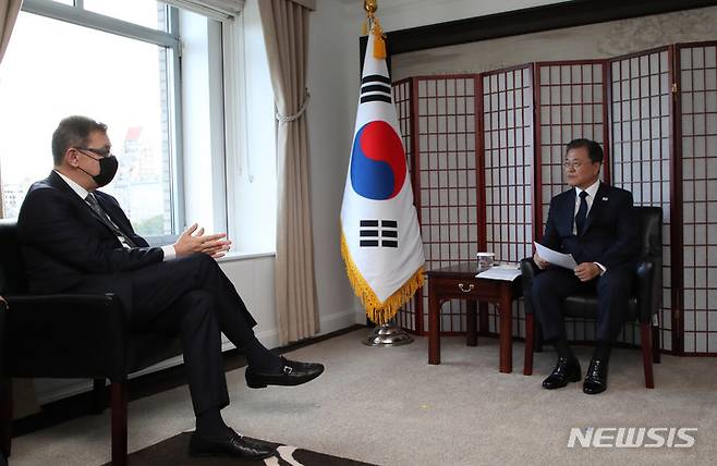 [뉴욕=뉴시스] 김진아 기자 = 문재인 대통령이 21일(현지시간) 미국 뉴욕의 한 호텔에서 앨버트 불라 화이자 최고경영자(CEO)의 발언을 듣고 있다. 2021.09.21. bluesoda@newsis.com
