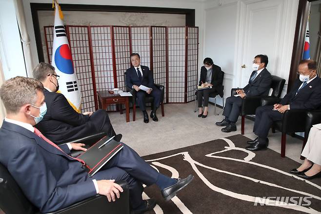 [뉴욕=뉴시스] 김진아 기자 = 문재인 대통령이 21일(현지시간) 미국 뉴욕의 한 호텔에서 앨버트 불라 화이자 최고경영자(CEO)를 접견, 발언하고 있다. 2021.09.21. bluesoda@newsis.com