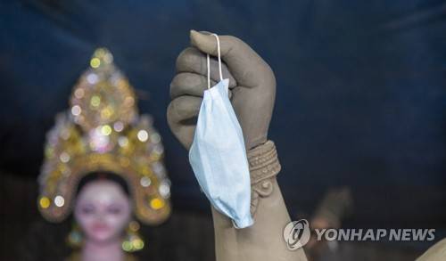 epa09479415 An artist's protective mask hangs from an idol inside a workshop ahead of the largest Durga Puja festival of the Bengali Hindus community in Dhaka, Bangladesh, 21 September 2021. The Durga Puja festivities will go ahead under COVID-19 restrictions for the second consecutive year. The festival, which celebrates the Goddess Durga defeating the demon Mahishasura, will take place mid-October 2021 . EPA/MONIRUL ALAM