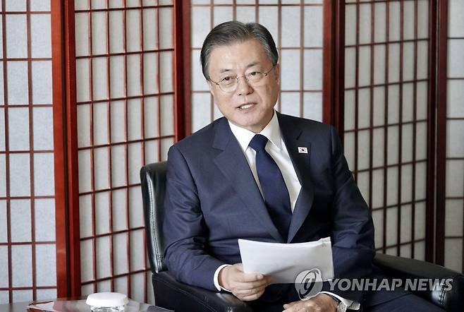 (뉴욕=연합뉴스) 최재구 기자 = 문재인 대통령이 21일(현지시각) 미국 뉴욕 시내 호텔에서 앨버트 불라 화이자 최고경영자(CEO)f를 접견하고 있다. 2021.9.21