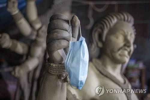 epa09479417 An artist's protective mask hangs from an idol inside a workshop ahead of the largest Durga Puja festival of the Bengali Hindus community in Dhaka, Bangladesh, 21 September 2021. The Durga Puja festivities will go ahead under COVID-19 restrictions for the second consecutive year. The festival, which celebrates the Goddess Durga defeating the demon Mahishasura, will take place mid-October 2021 . EPA/MONIRUL ALAM