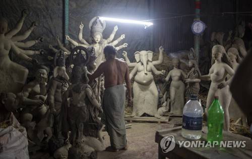 epa09479419 An artist works on an idol of the Goddess Durga ahead of the largest Durga Puja festival of the Bengali Hindus community in Dhaka, Bangladesh, 21 September 2021. The Durga Puja festivities will go ahead under COVID-19 restrictions for the second consecutive year. The festival, which celebrates the Goddess Durga defeating the demon Mahishasura, will take place mid-October 2021 . EPA/MONIRUL ALAM