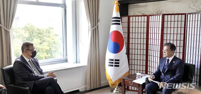 [뉴욕=뉴시스] 김진아 기자 = 문재인 대통령이 21일(현지시간) 미국 뉴욕의 한 호텔에서 앨버트 불라 화이자 최고경영자(CEO)를 접견, 발언하고 있다. 2021.09.21. bluesoda@newsis.com