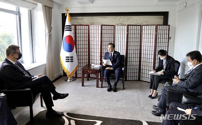[뉴욕=뉴시스] 김진아 기자 = 문재인 대통령이 21일(현지시간) 미국 뉴욕의 한 호텔에서 앨버트 불라 화이자 최고경영자(CEO)를 접견, 발언하고 있다. 2021.09.21. bluesoda@newsis.com
