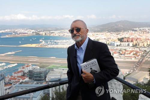 epa09479443 Spanish writer Arturo Perez-Reverte poses for photographers during the presentation of his latest novel 'El italiano' (lit. 'The Italian'), in Gibraltar, 21 September 2021. The book tells the story of Italian divers during World War II as they were given the task of sinking vessels in Gibraltar and Algeciras bay. EPA/A. Carrasco Ragel