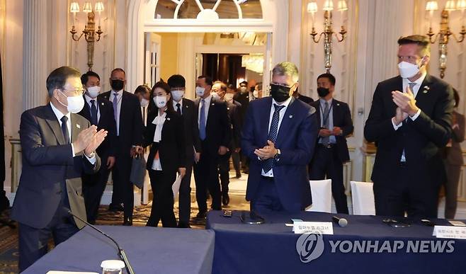 (뉴욕=연합뉴스) 최재구 기자 = 문재인 대통령이 21일(현지시각) 미국 뉴욕 시내 호텔에서 열린 한미 백신 협력 협약 체결식에 참석하고 있다. 2021.9.21