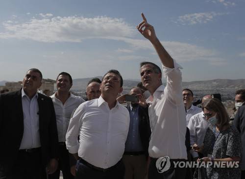 epa09479518 Mayor of Athens Kostas Bakoyannis (C-R) and mayor of Istanbul Ekrem Imamoglu (C-L) during their visit atop the Acropolis hill in Athens, Greece, 21 September 2021. EPA/KOSTAS TSIRONIS