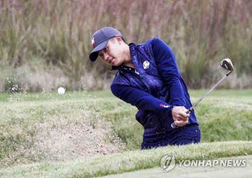 epa09479706 US team member Collin Morikawa hits from a sand trap by the chipping green during practice for the pandemic-delayed 2020 Ryder Cup golf tournament at the Whistling Straits golf course in Kohler, Wisconsin, USA, 21 September 2021. Competition for the 43rd Ryder Cup between the US and Europe begins 24 September 2021. EPA/TANNEN MAURY