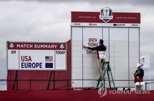 epa09479707 A worker prepares a sign by the eighteenth hole during practice for the pandemic-delayed 2020 Ryder Cup golf tournament at the Whistling Straits golf course in Kohler, Wisconsin, USA, 21 September 2021. Competition for the 43rd Ryder Cup between the US and Europe begins 24 September 2021. EPA/TANNEN MAURY