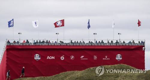 epa09480250 Flags fly above a grandstand overlooking the seventh green during practice for the pandemic-delayed 2020 Ryder Cup golf tournament at the Whistling Straits golf course in Kohler, Wisconsin, USA, 21 September 2021. Competition for the 43rd Ryder Cup between the US and Europe begins 24 September 2021. EPA/TANNEN MAURY