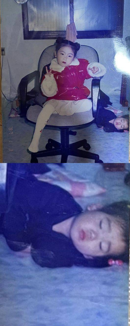 공개된 사진은 친언니가 의자에 앉아 카메라 앞에서 포즈를 취하고 있는 와중에 승희는 잠을 자고 있는 모습.