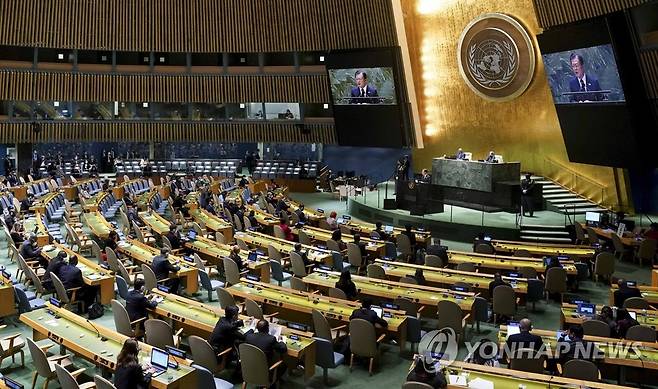 (뉴욕=연합뉴스) 최재구 기자 = 문재인 대통령이 21일(현지시각) 미국 뉴욕 유엔 총회장에서 기조연설을 하고 있다. 2021.9.22